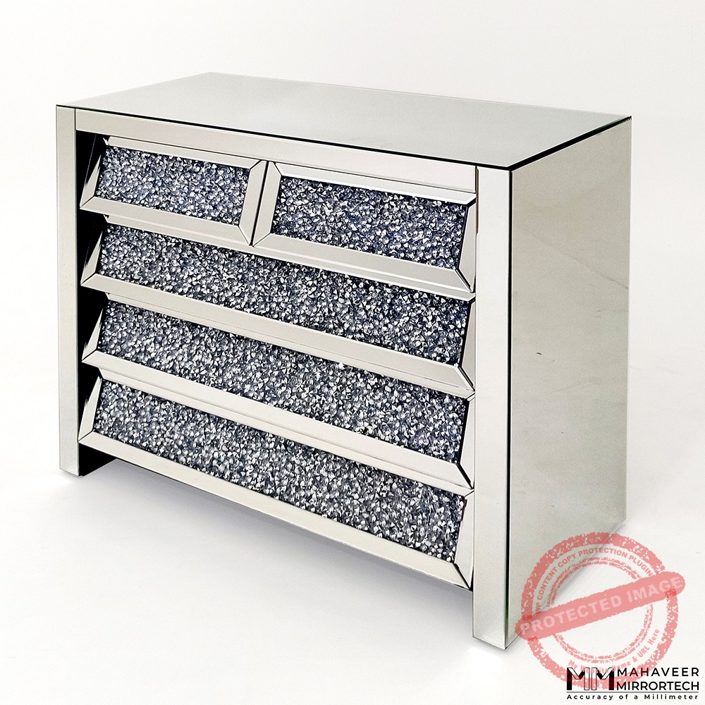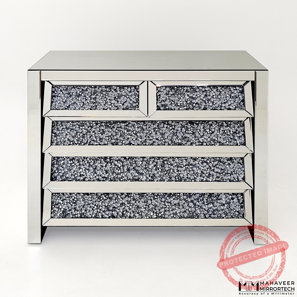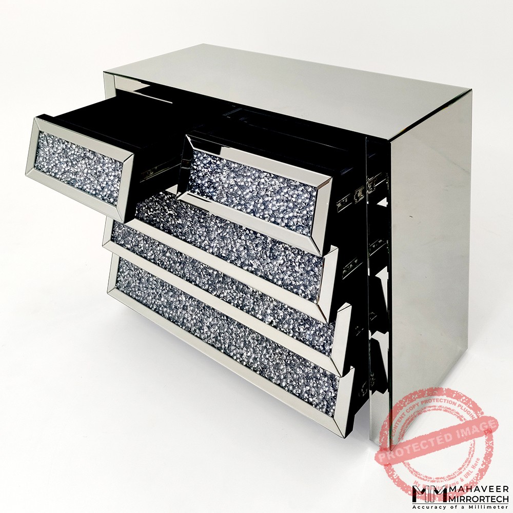 A side Board , also known as a buffet table or credenza, , is a form of table with elegant storage solution and place for decoration .It takes up less room space . It can be maintained in the living room or kitchen for storage of cutlery. It can also be maintained in bedroom to store underwear, socks, and other items that aren’t generally hanging in or stored in the closet. It offers plenty of room for all your trinkets and trinkets. This mirrored side board goes with any colour scheme or piece of furniture. It has a gytsby or diamond filling in it, which gives it a glam and luxurious appearance. Its existence is marked by soft closing drawers without handles.
